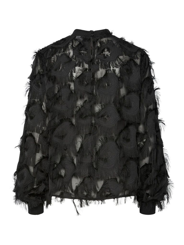 Dieses Oberteil besticht durch ein verspieltes Fransen-Muster und einen modernen Schnitt. Die Laternenärmel verleihen dem Look eine elegante Silhouette, während der Reißverschluss am Rücken für ein einfaches An- und Ausziehen sorgt. Der Regular Fit bietet angenehmen Tragekomfort, und das leichte, ungefütterte Material macht es ideal für vielseitige Stylingmöglichkeiten.