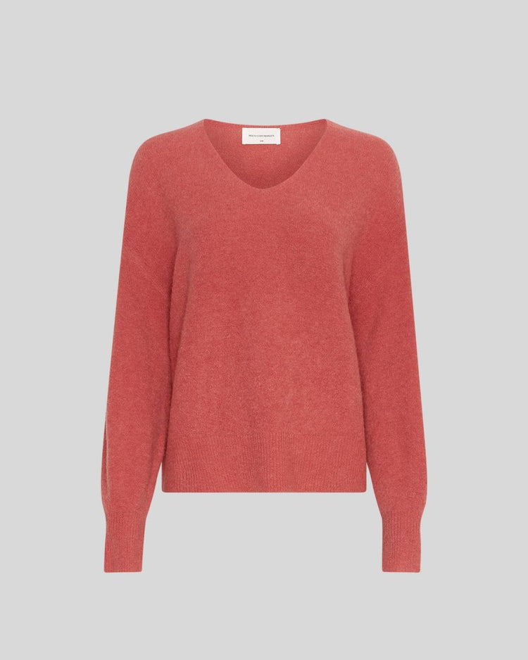 Gestrickter Pullover mit V-Ausschnitt. Langarm mit Rippbündchen und Rippabschluss. Mit überschnittenen Schultern.