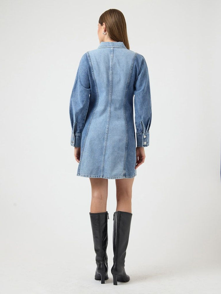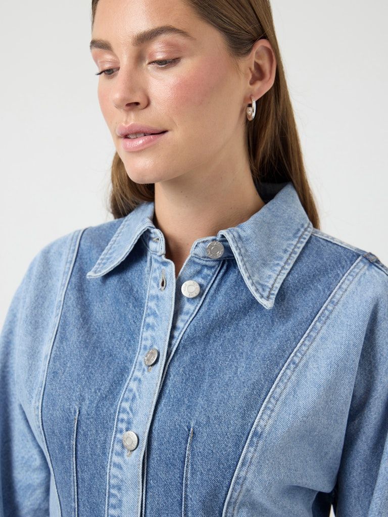 Dieses Jeanskleid vereint zeitlosen Denim-Charme mit moderner Alltagstauglichkeit. Der klassische Hemdkragen und die lange Ärmel mit knöpfbaren Manschetten verleihen dem Kleid einen gepflegten Look, während die Knopfleiste vorne praktische Funktionalität bietet.
