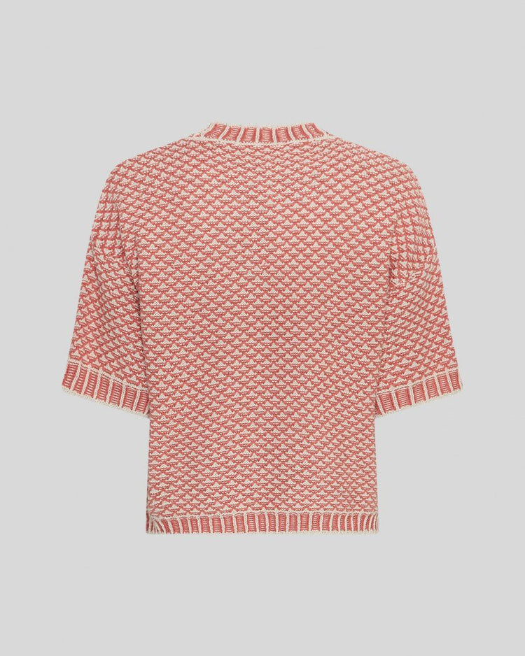 Gestrickter Pullover mit grafischem Muster und locker geschnittenen kurzen Ärmeln. Gerippte Abschlüsse an Ausschnitt, Ärmeln und Saum sorgen für ein modernes und klares Design. Ideal für vielseitige Alltagslooks.