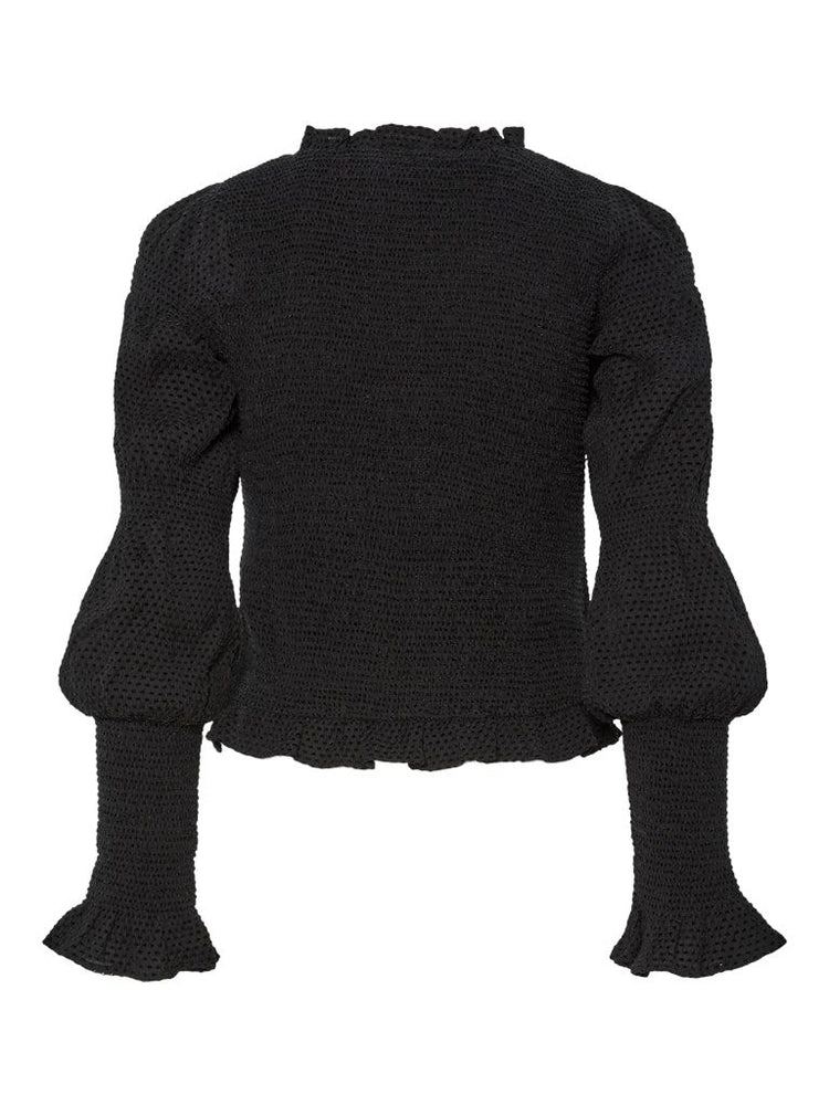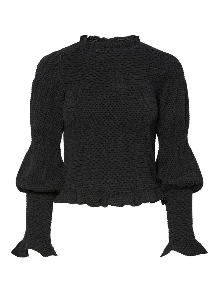 Diese Bluse besticht durch ihren klassischen Rundhalsausschnitt und lange Ärmel mit gesmokten Bündchen, die für einen verspielten und femininen Akzent sorgen. Weitere gesmokte Details unterstreichen das elegante Design, während die normal geschnittene Passform angenehmen Tragekomfort bietet – ideal für stilvolle Looks im Alltag oder Büro.