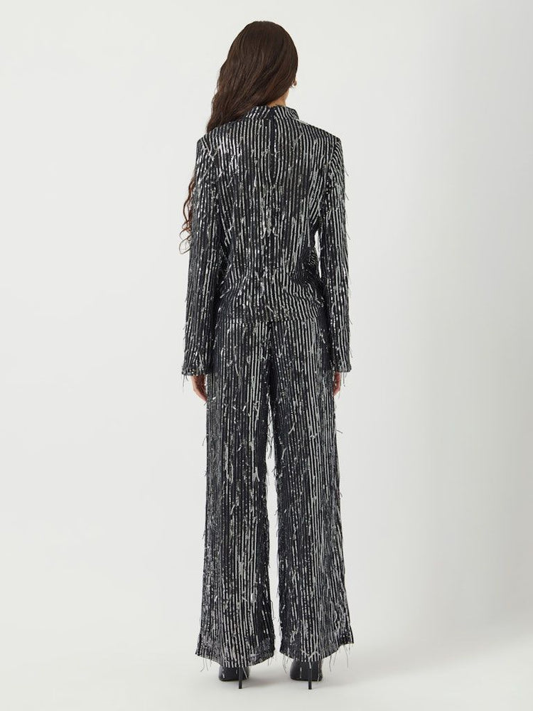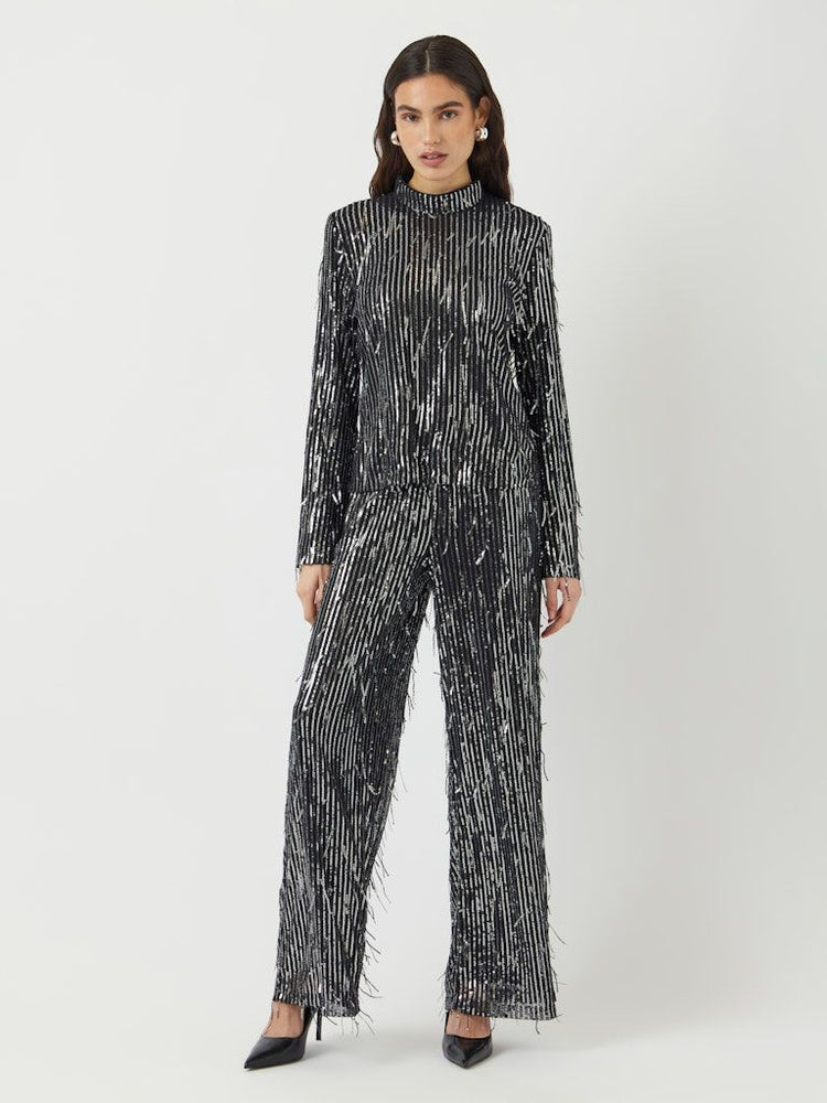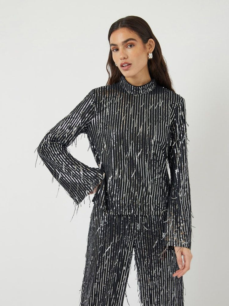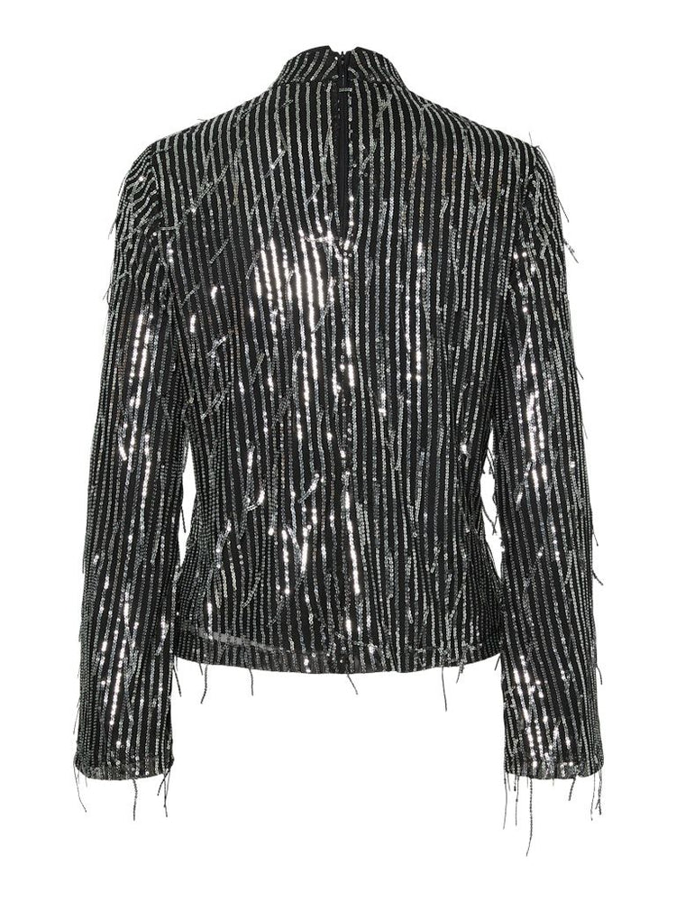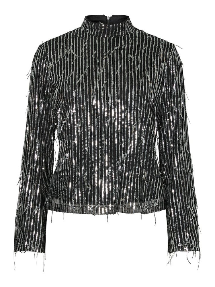 Dieses T-Shirt aus glitzerndem Paillettenstoff sorgt für einen spektakulären Auftritt. Es verfügt über einen hohen Kragen und lange Ärmel, die dem Design eine elegante Note verleihen. Die Pailletten setzen funkelnde Akzente, während die Regular-Fit-Passform für angenehmen Tragekomfort sorgt und das T-Shirt perfekt für besondere Anlässe oder glamouröse Looks macht.