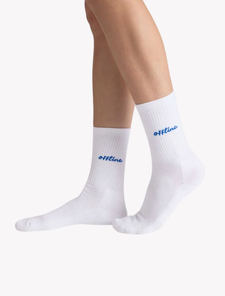 Sag Offline und gönn dir eine Pause. Dieser Socken bringt mit cleanem weiß und dem blauen offline Schriftzug genau die Ruhe rein, die du brauchst. Digital Detox für die Füße – und für deinen Style. Teil unserer Colorful Statement Kollektion. Superbequem, langlebig, fair produziert in Portugal.